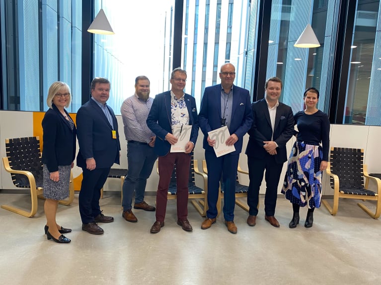 Kuvassa keskellä sopimuksen allekirjoittajat, Juha Luusua Elteliltä ja Simo Mustila Metropoliasta, ja heidän vierellään muita työelämäkumppanuuteen osallistuvia työntekijöitä Elteliltä ja Metropoliasta.